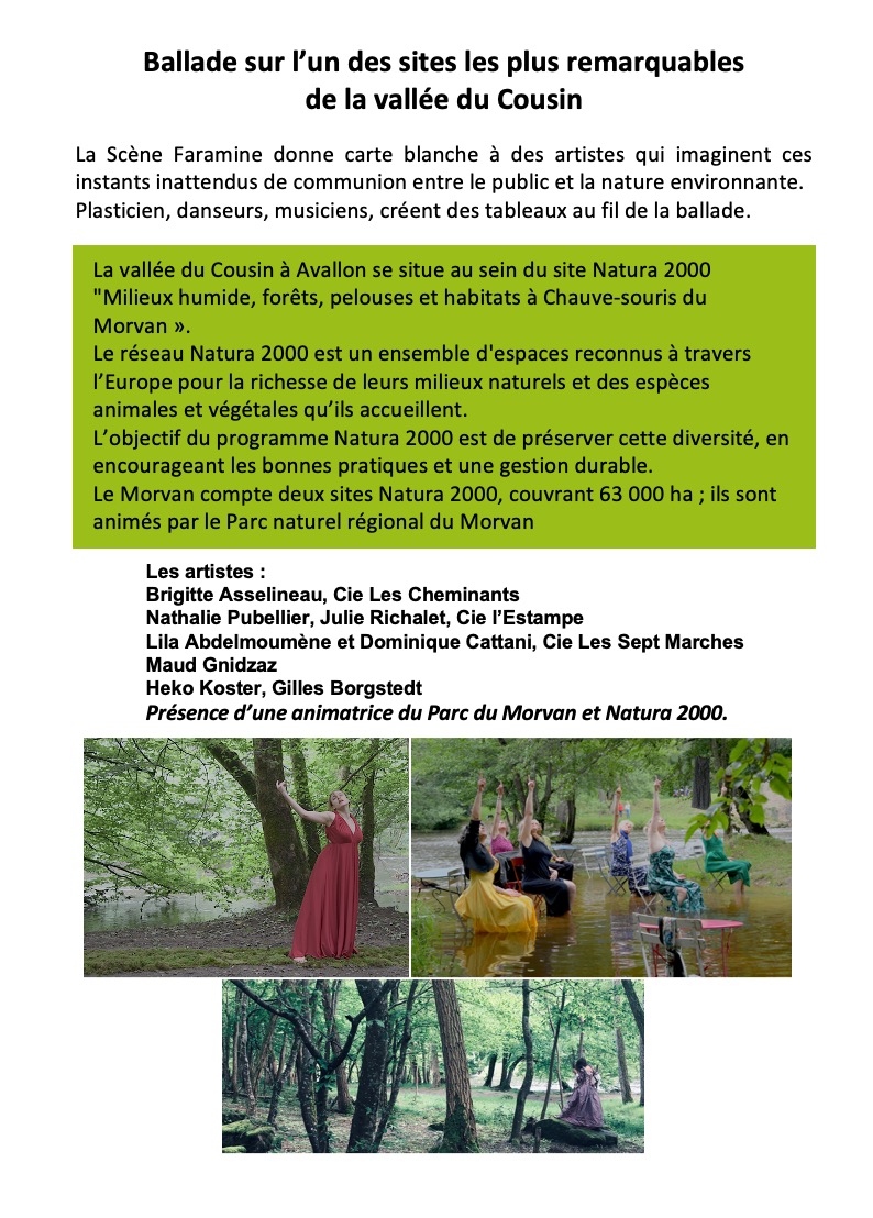 Au cours de ces balades artistiques, poétiques et sensorielles, plasticien, danseurs, musiciens, créent des tableaux le long du Cousin. Les artistes imaginent des instants inattendus de communion entre le public et la nature environnante. Justine accompagnera les participants pour aborder l'aspect naturaliste du site.