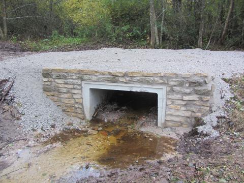 Automne 2020 : pose d’un dalot sans fond. Ce type d’ouvrage permet de conserver le lit naturel du cours d’eau.